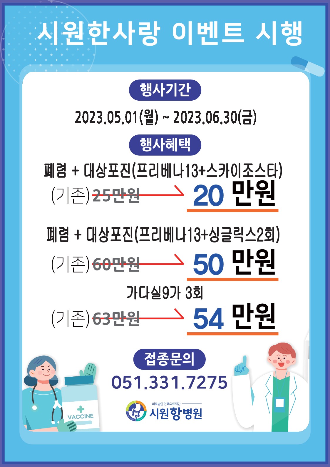 | 71 | 시원한사랑 이벤트 시행(대상포진, 폐렴구균, 가다실9가) | 2023-05-15 | 1026 |